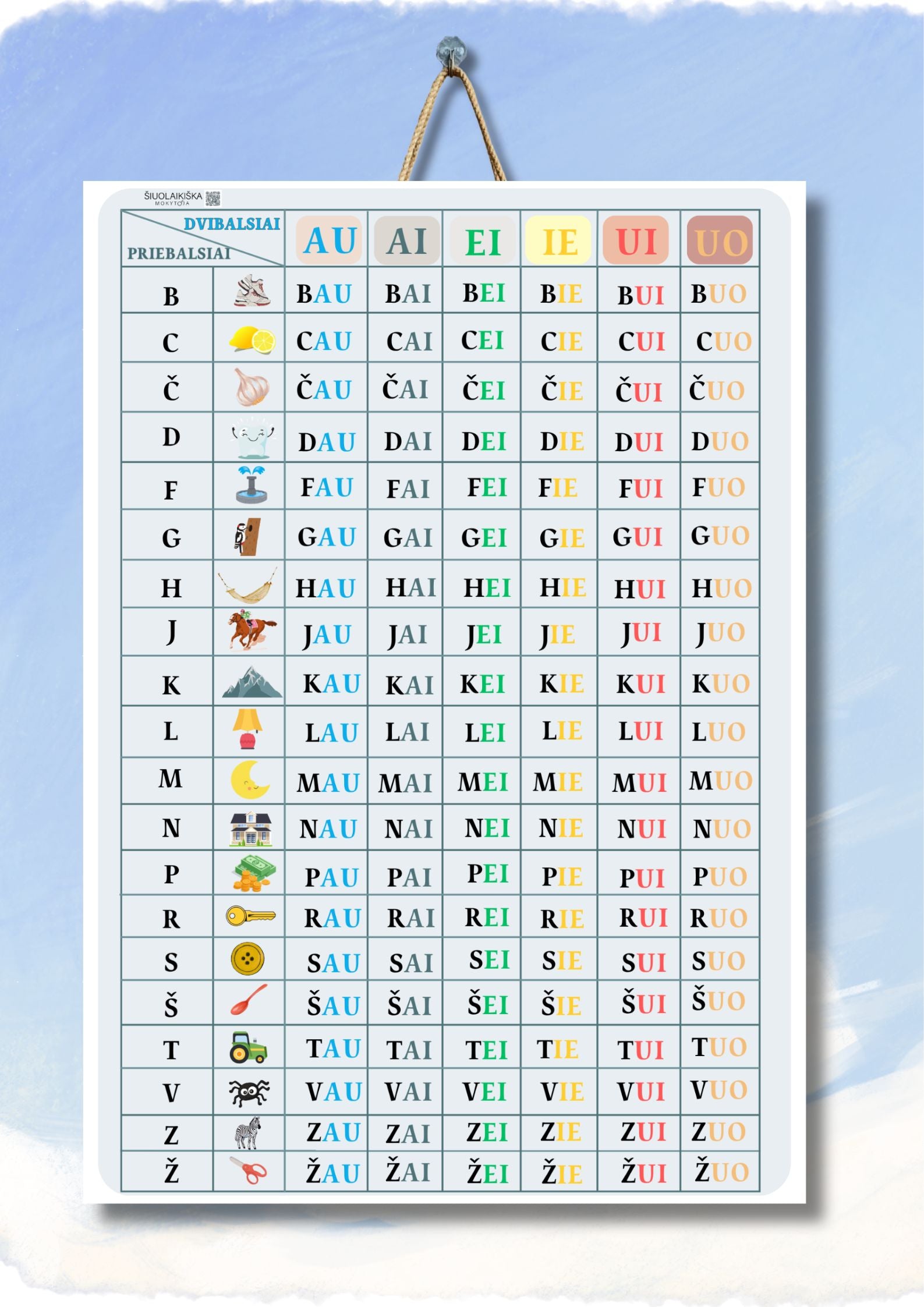 Šis spalvingas ir aiškiai išdėstytas skaitymo plakatas padeda vaikams išmokti dvibalsių junginių su priebalsėmis, pavyzdžiui: BAU, BAI, BEI, BIE... ir t. t.
